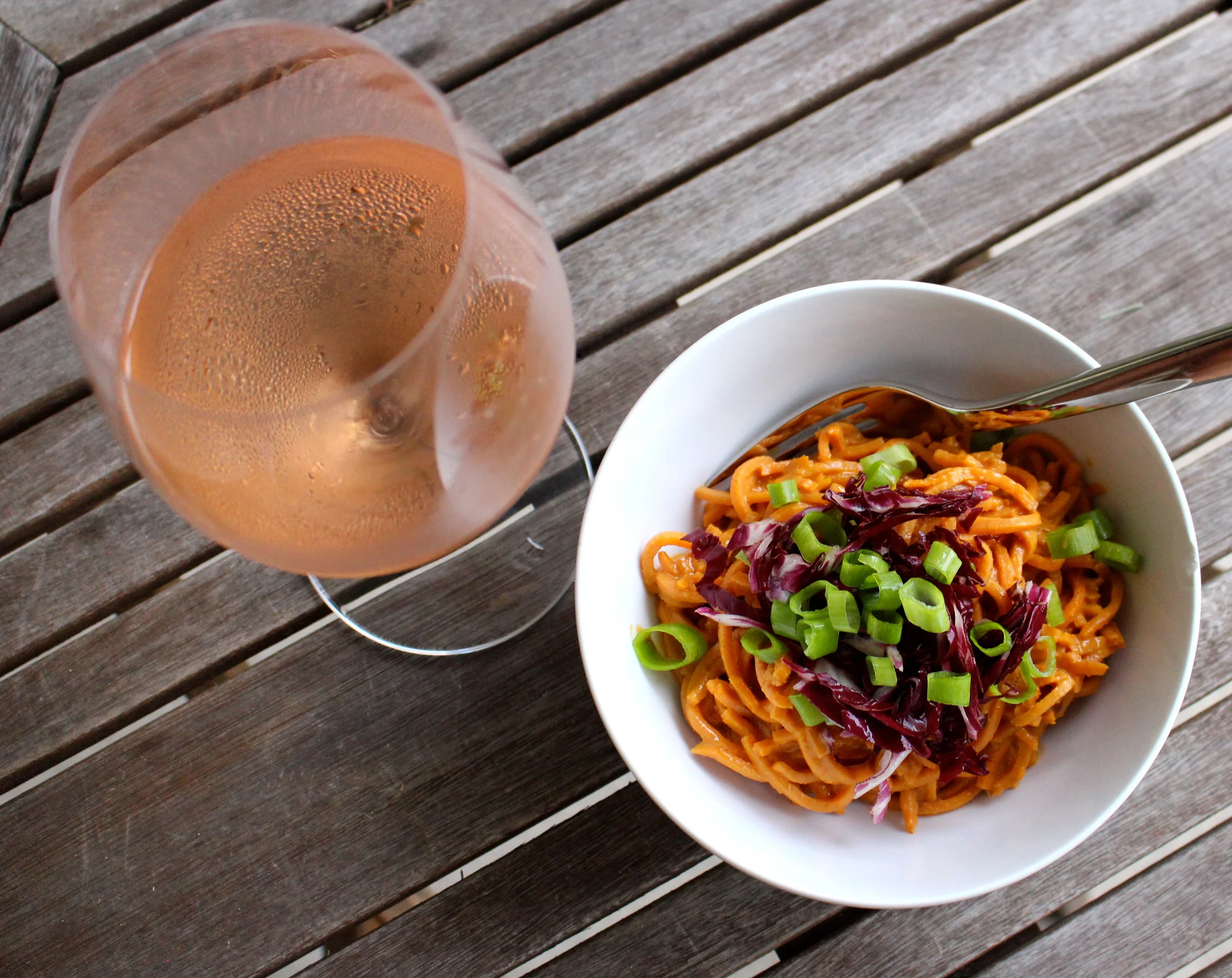 Using a spiralizer or a julienne peeler, make (long) noodles with the sweet potato.